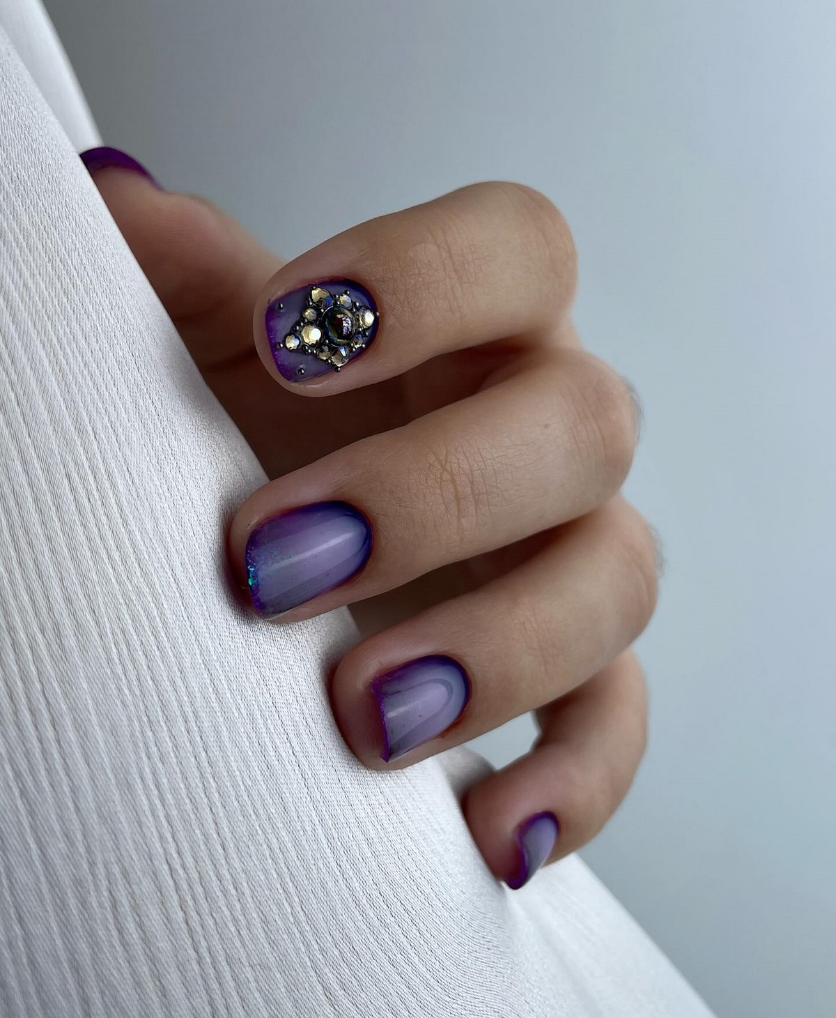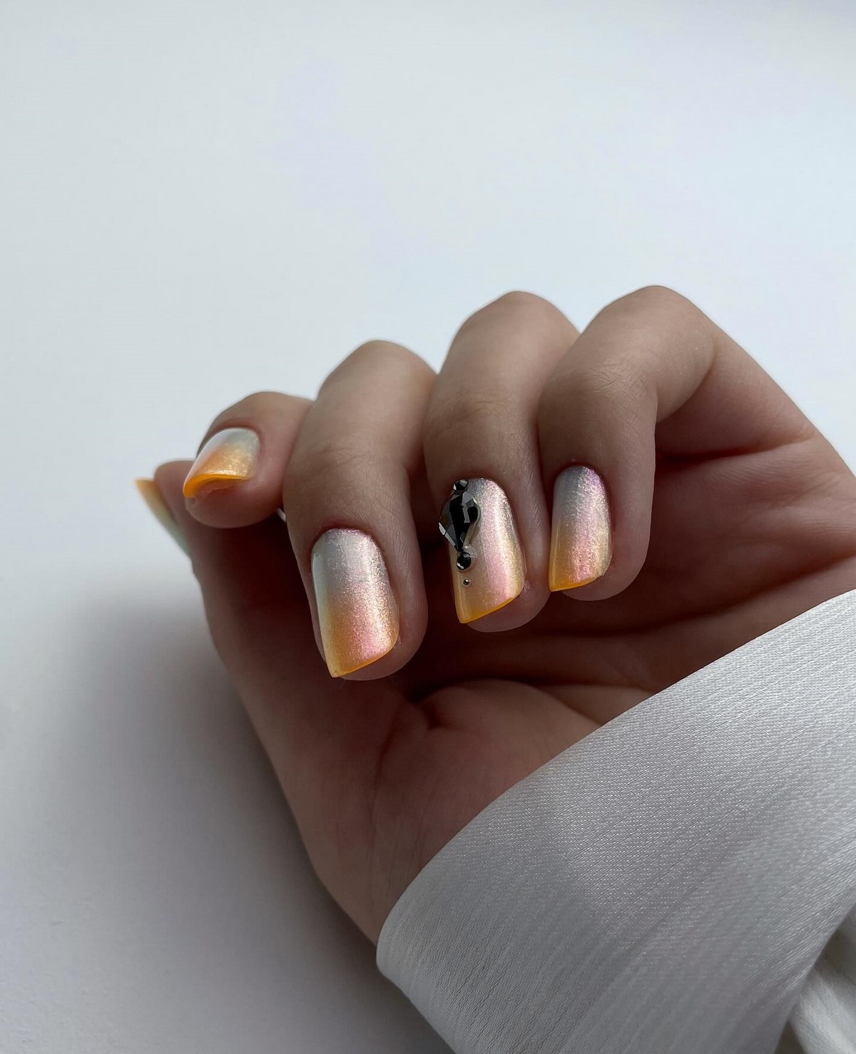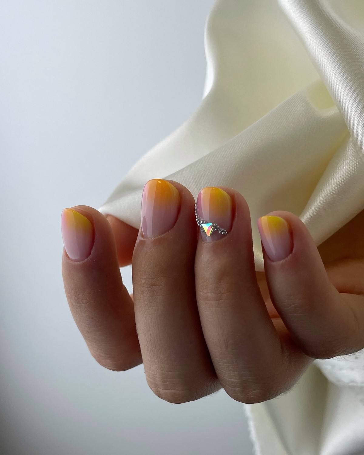 Стрази в градієнтному манікюрі осені 2025 розташовуються не хаотично, а слідують лінії колірного переходу. Дрібні камені підбираються в тон градієнту, створюючи ефект розсипу коштовностей. Особливо ефектно виглядають бурштинові і топазові стрази на теракотових градієнтах.