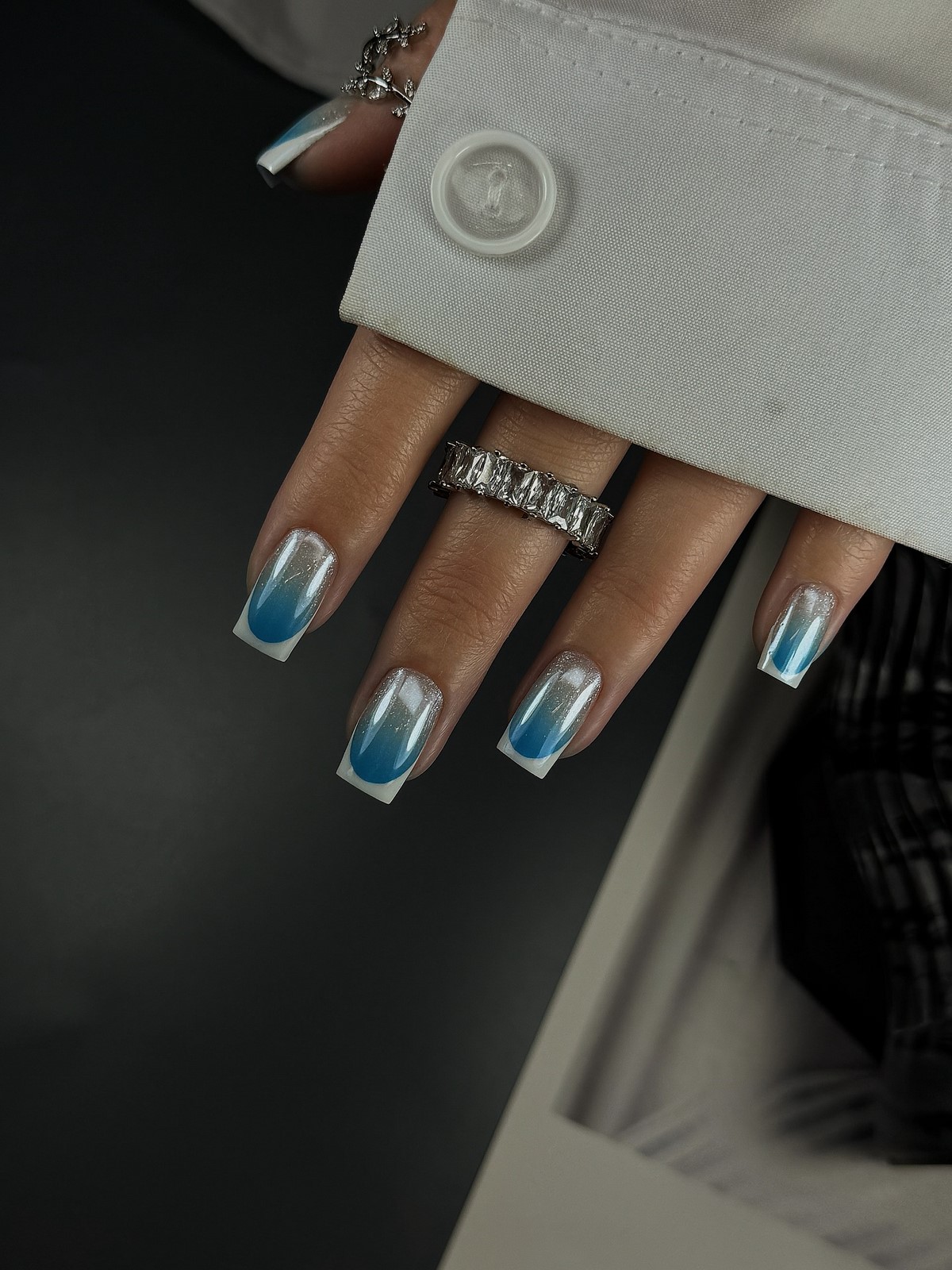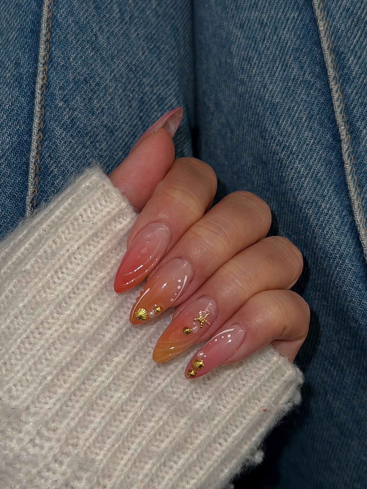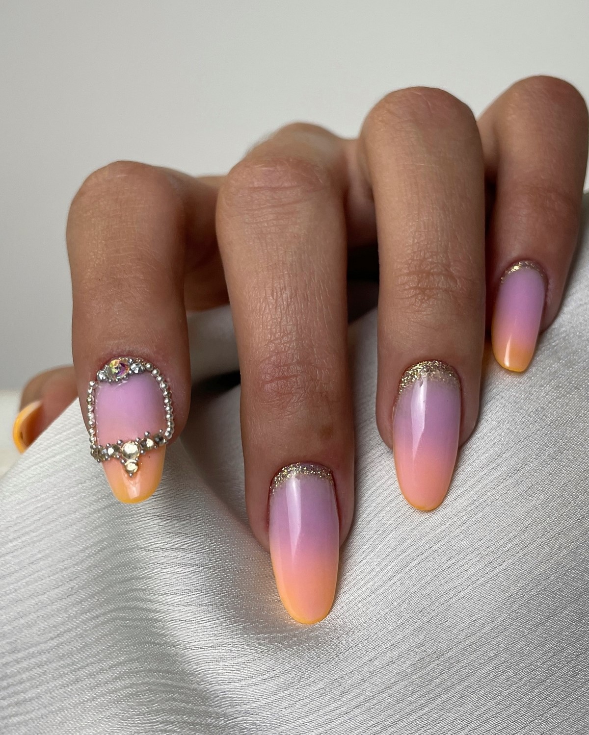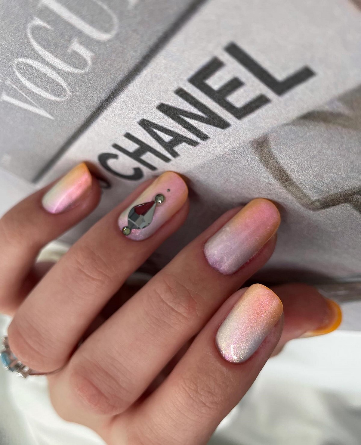 Стрази в градієнтному манікюрі осені 2025 розташовуються не хаотично, а слідують лінії колірного переходу. Дрібні камені підбираються в тон градієнту, створюючи ефект розсипу коштовностей. Особливо ефектно виглядають бурштинові і топазові стрази на теракотових градієнтах.