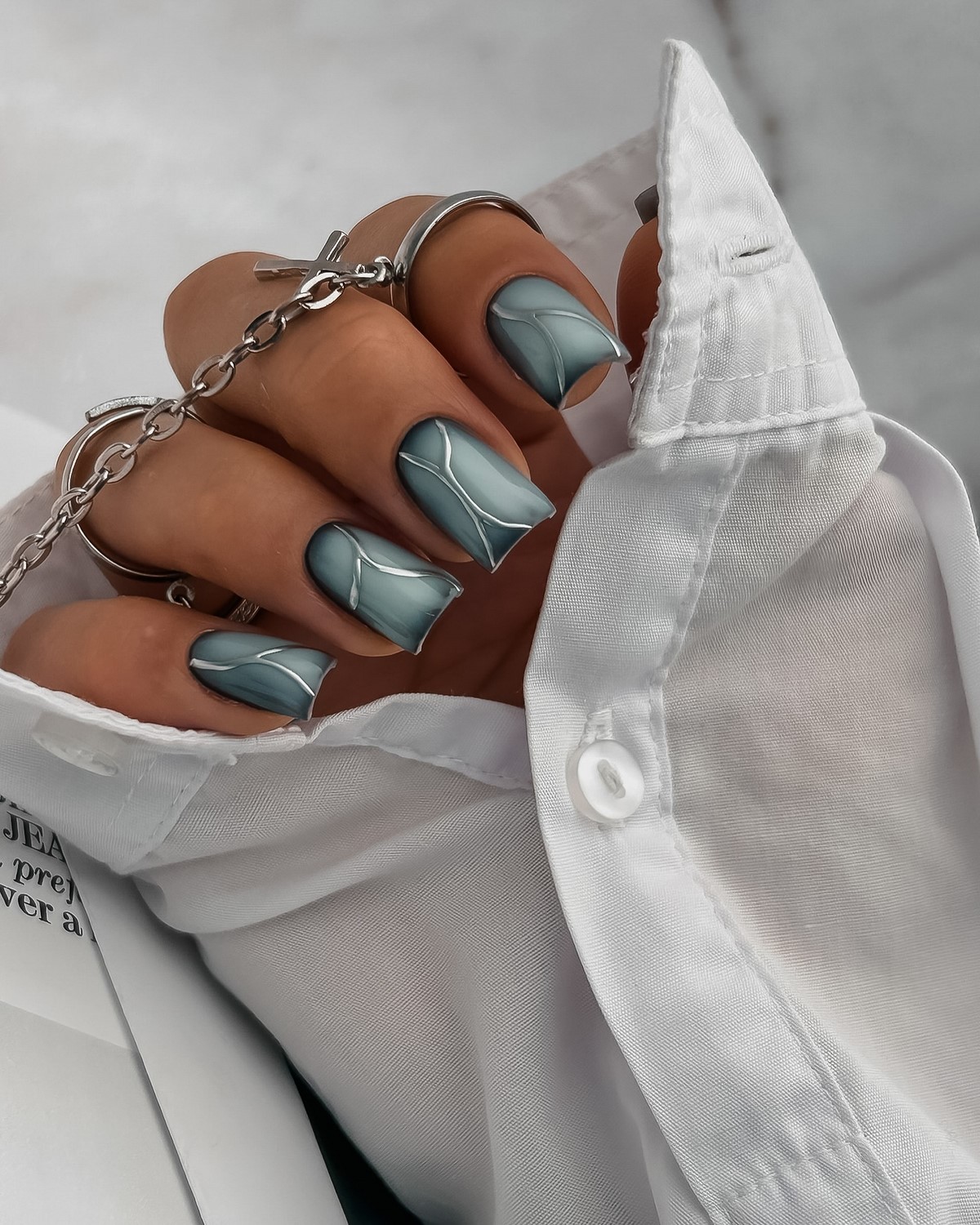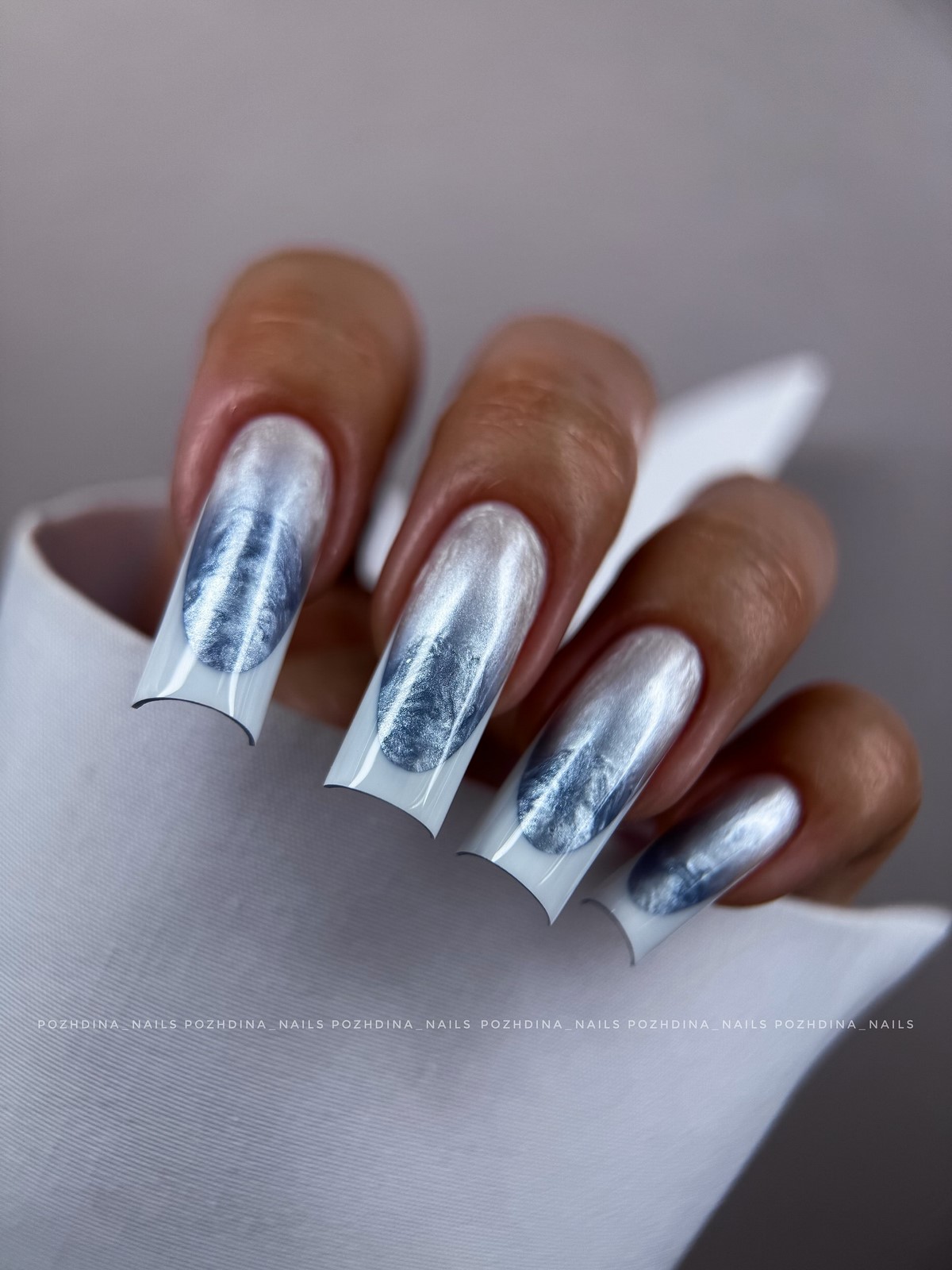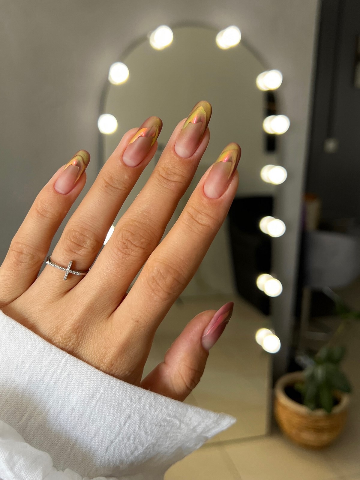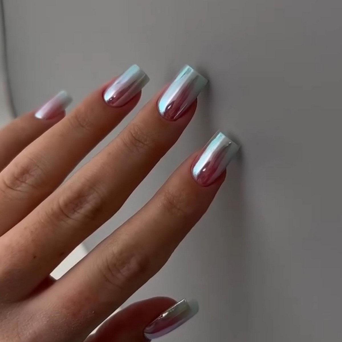 Дзеркальні втирки в градієнтному виконанні створюють ефект рідкого металу. Осінні варіанти включають переходи від хромованого срібла до матового графіту або від золотої втирки до прозорої бази. Техніка вимагає ідеально гладкої поверхні і професійних навичок нанесення.