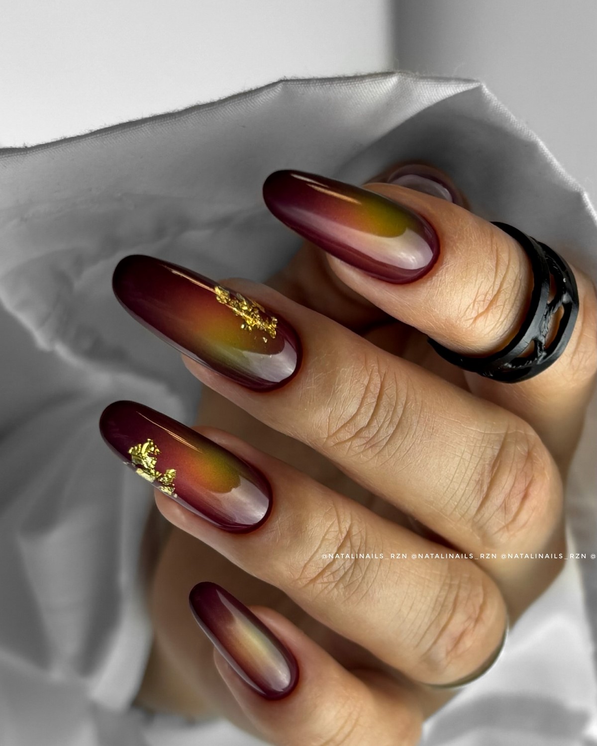 Техніка «аура» являє собою м’яке світіння навколо кутикули або по краях нігтя. В осінній версії використовуються теплі відтінки – золотистий, мідний або теракотовий, що створюють ефект внутрішнього світіння. Особливість осіннього аура-манікюру полягає у використанні матових базових тонів з глянцевими градієнтними вставками.
