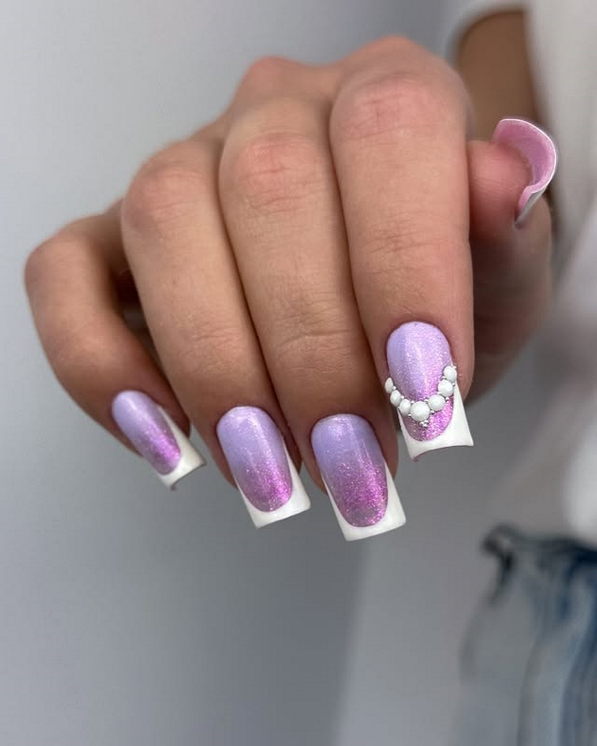 - Подвійний френч із сяйвом. Складніша техніка, де використовуються дві лінії посмішки різних відтінків, обов’язково з перламутровим або металевим фінішем.