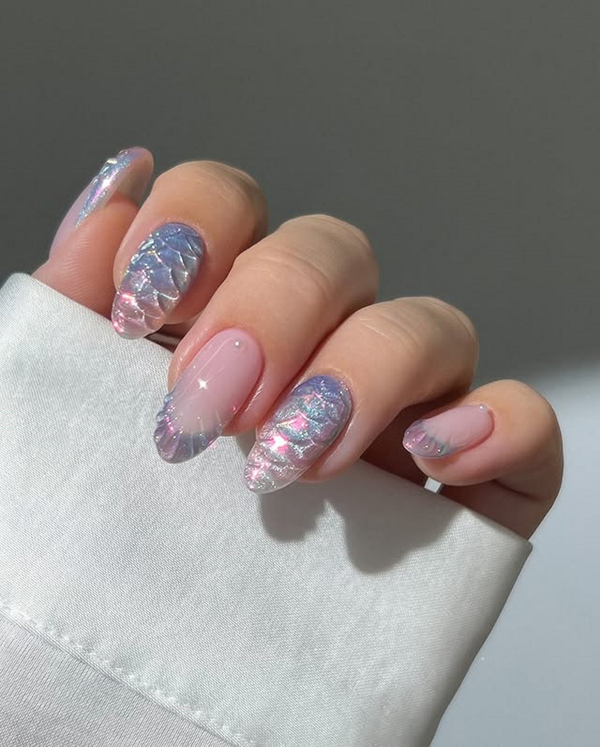 Головна особливість сяючого френча – використання сучасних гель-лаків з ефектом перламутру або дрібного шиммера. На відміну від грубого глітеру, популярного в минулих сезонах, перламутровий фініш створює ніжне, немов морська піна, сяйво, що змінюється залежно від освітлення і кута зору.