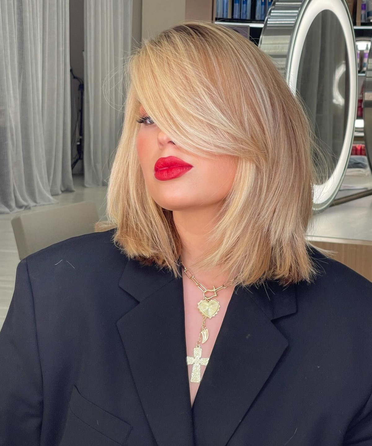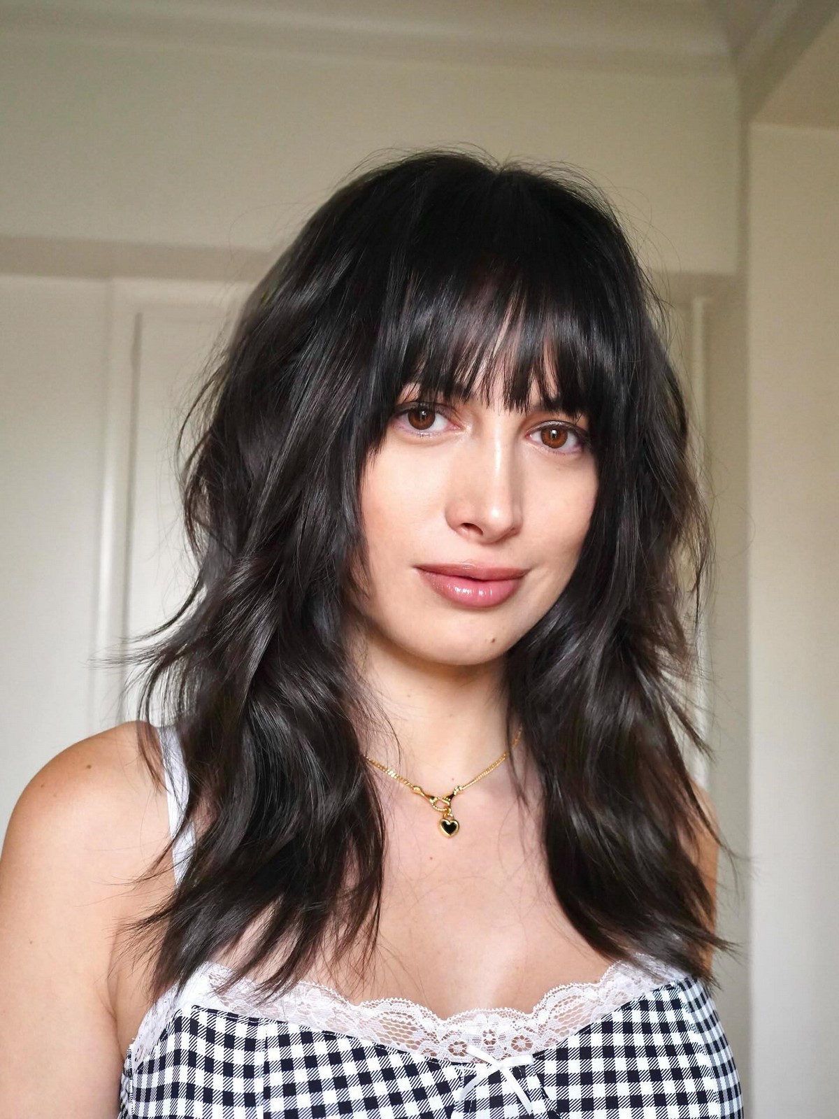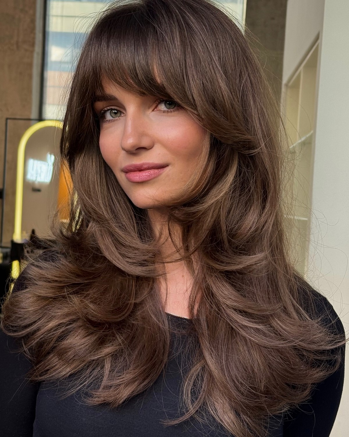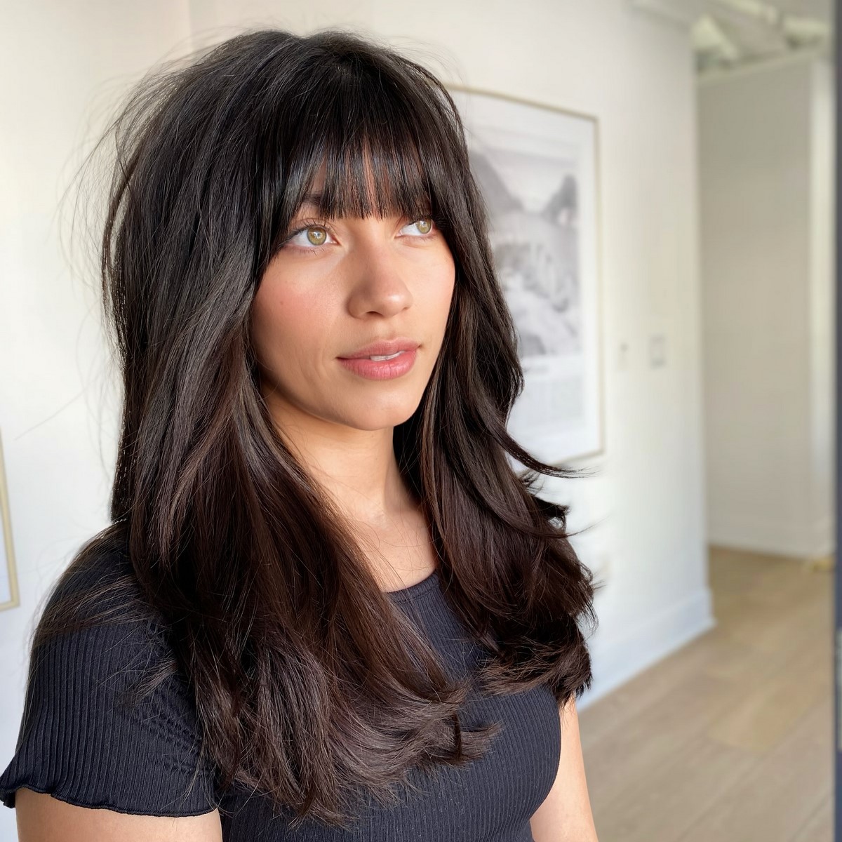 Класика, яка завжди в моді. У 2025 році він стає більш легким, іноді злегка прорідженим, щоб не обтяжувати образ. Прямий чубчик ідеально підходить для густого волосся і робить образ витонченим і строгим.