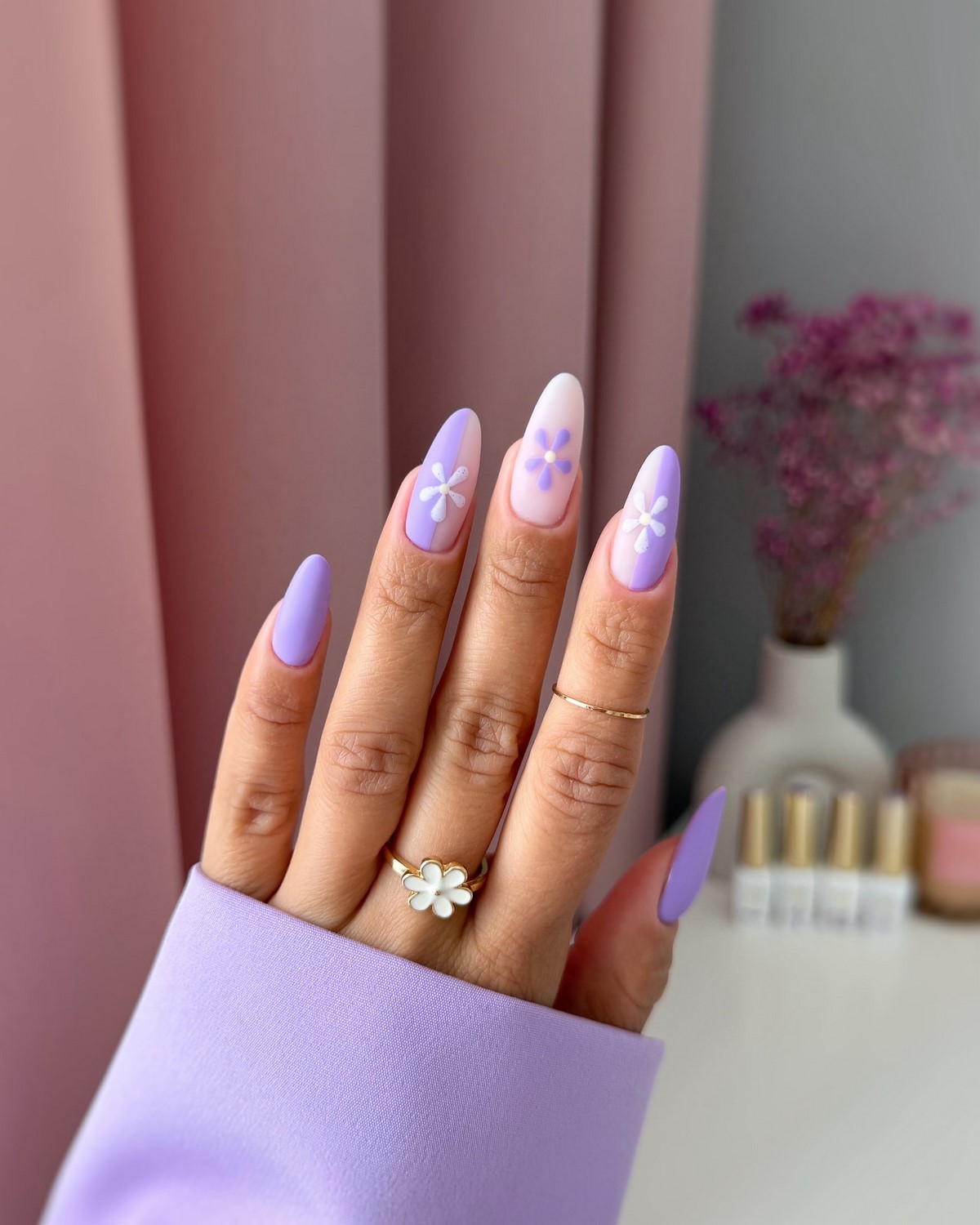 Ніжний лавандовий відтінок стає одним з фаворитів сезону, втілюючи жіночність і романтичність. Цей приглушений фіолетовий тон ідеально пасує для весняних образів і прекрасно поєднується з білими, бежевими і сірими вбраннями. Дизайнери рекомендують доповнювати лавандовий манікюр мінімалістичними срібними деталями для створення витонченого і сучасного образу.