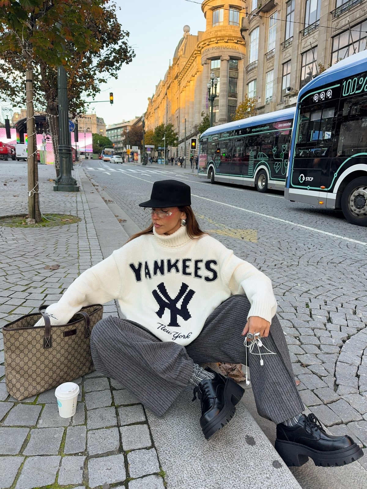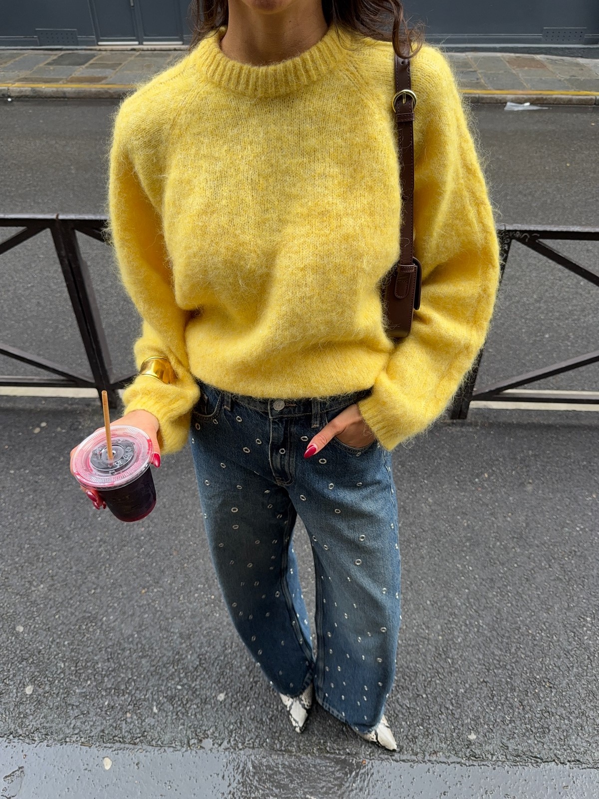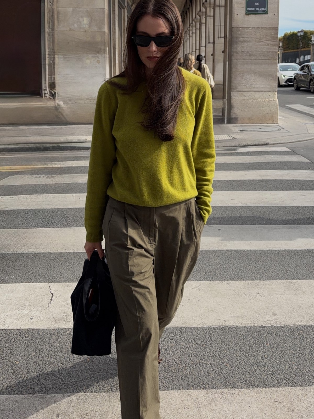 Його носять з нейтральними кольорами — сірим, чорним, молочним і синім. Такий светр додає енергії та візуальної впевненості, навіть якщо решта образу максимально проста.