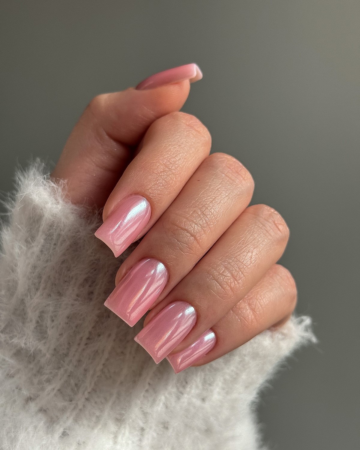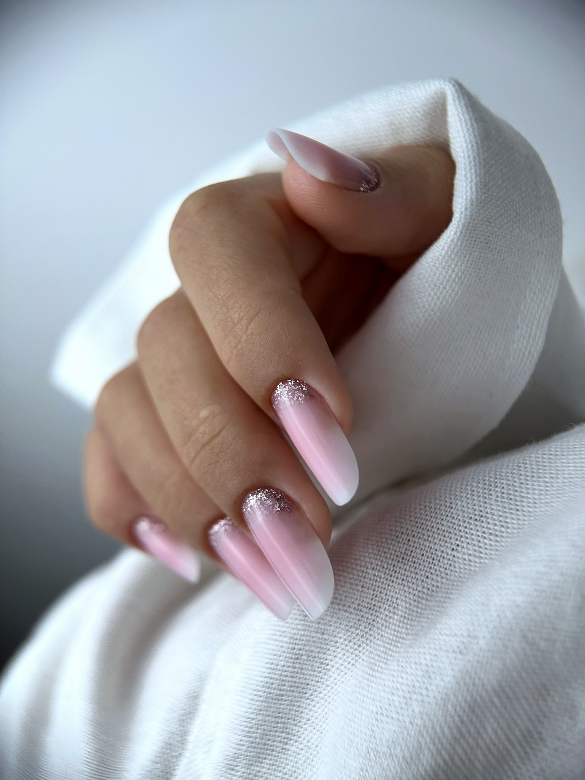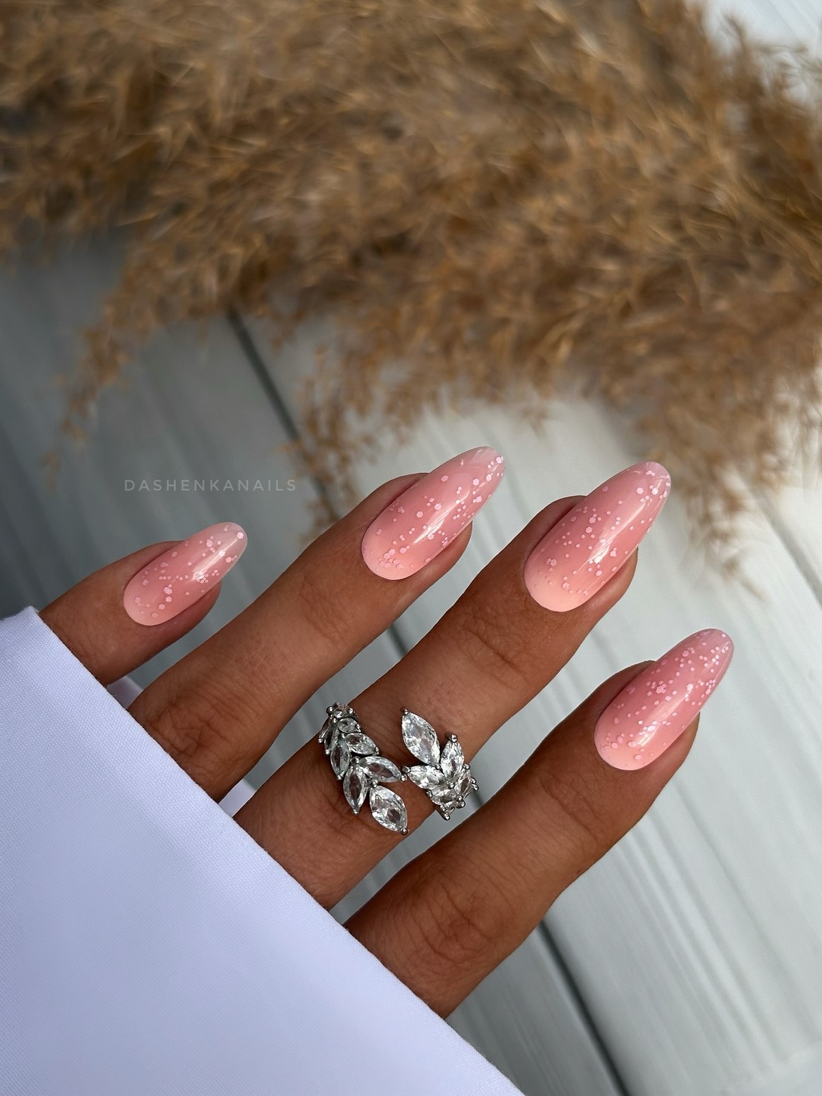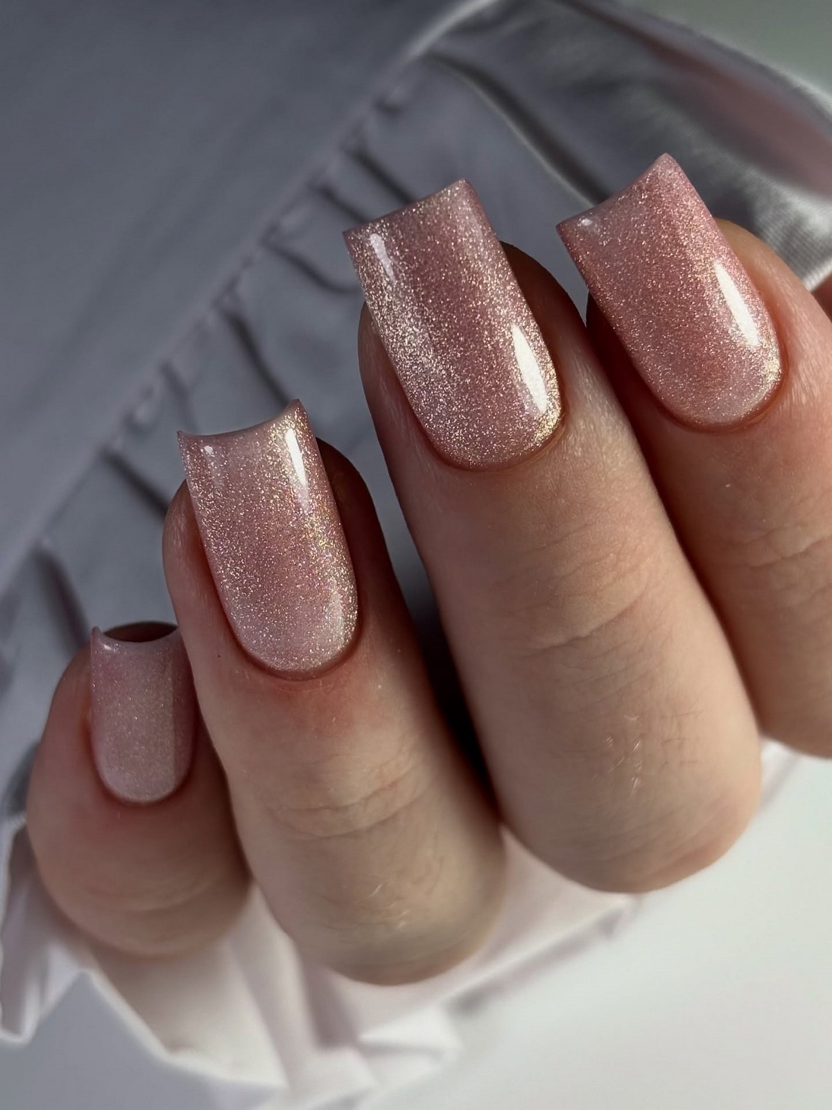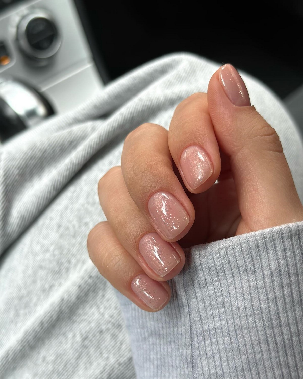 Нюдове покриття з мікроскопічними блискітками створює ефект «запиленості зірками». Найдрібніші світловідбиваючі частинки рівномірно розподіляються в прозорій або злегка тонованій основі. Результат – делікатне сяйво, яке підкреслює природну красу нігтів і підходить для будь-якої пори доби, від ділового ранку до романтичного вечора.