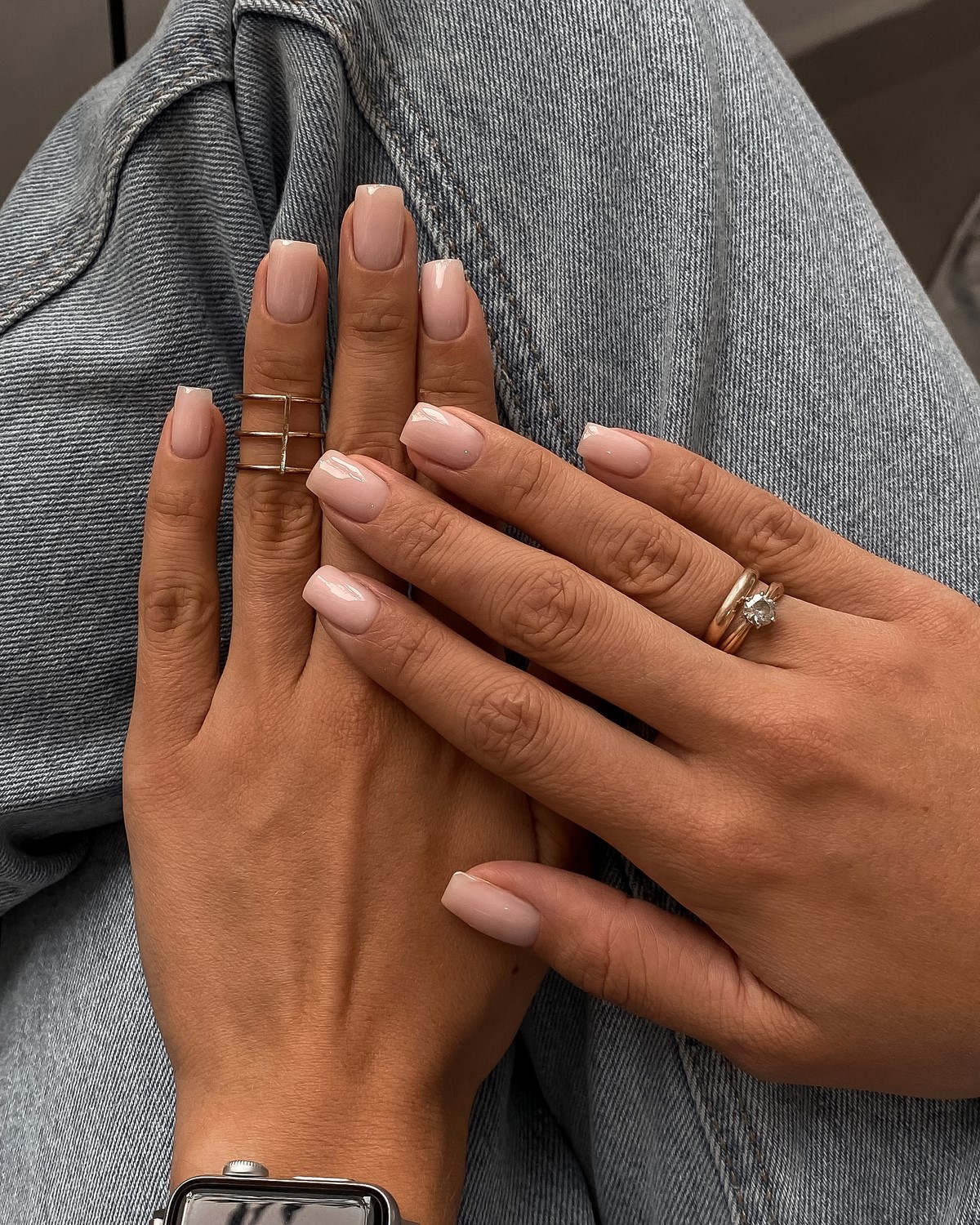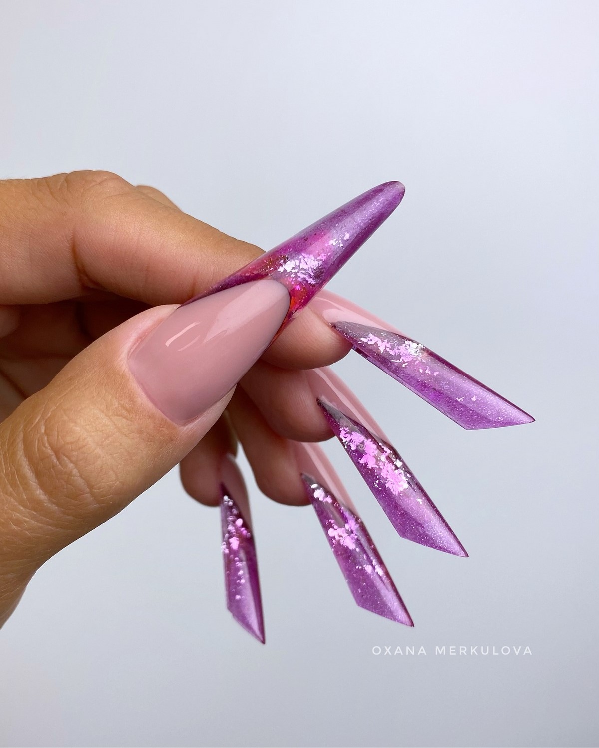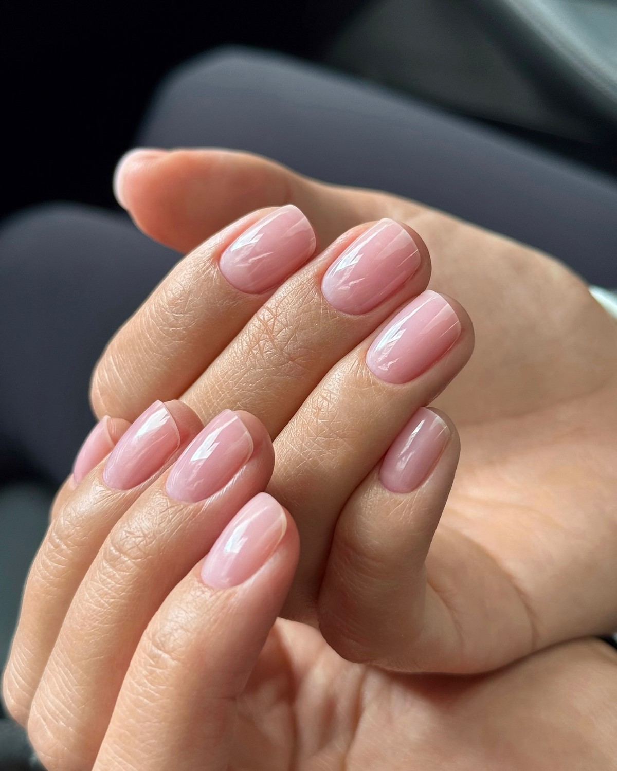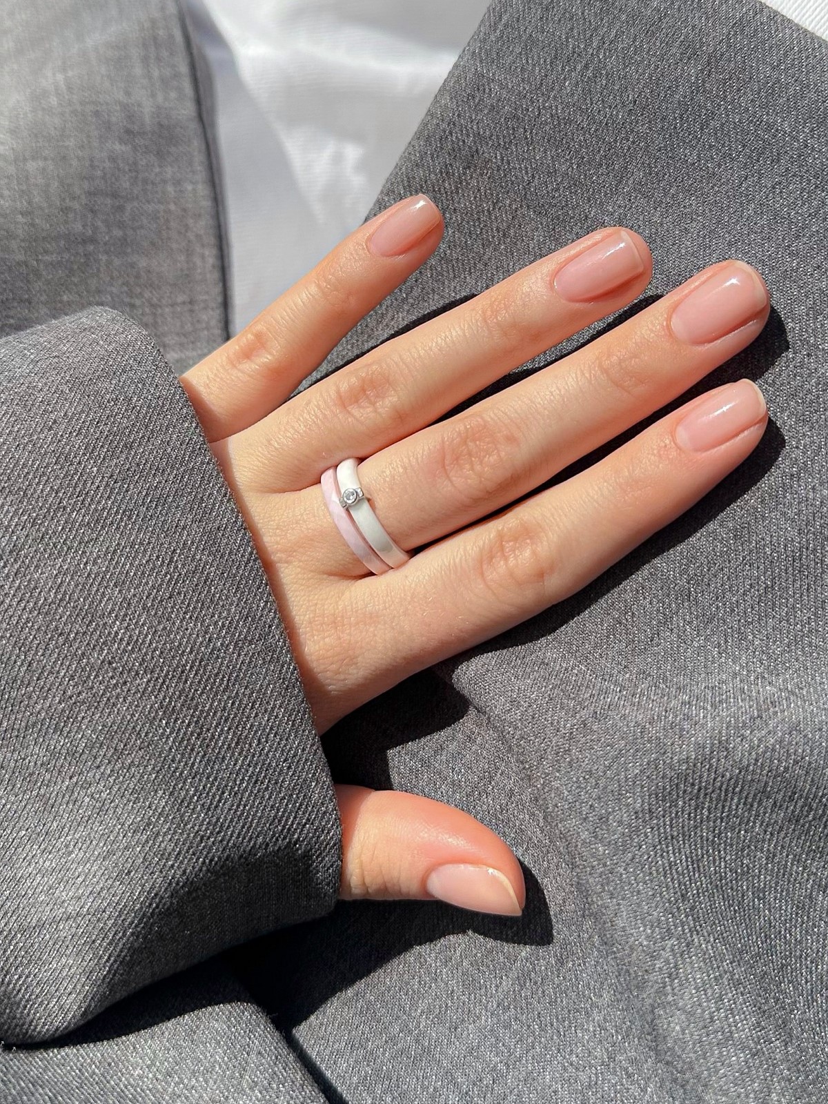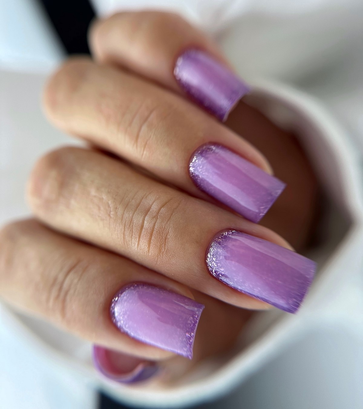 Нюдове покриття з мікроскопічними блискітками створює ефект «запиленості зірками». Найдрібніші світловідбиваючі частинки рівномірно розподіляються в прозорій або злегка тонованій основі. Результат – делікатне сяйво, яке підкреслює природну красу нігтів і підходить для будь-якої пори доби, від ділового ранку до романтичного вечора.