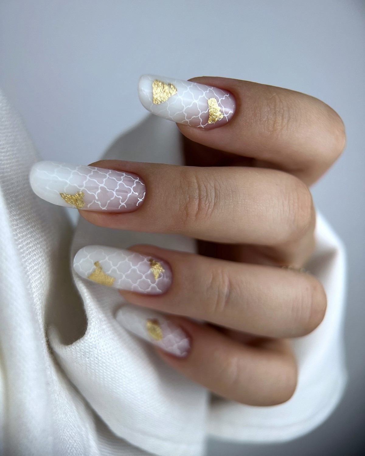 Комбінація техніки стемпінгу з нанесенням поталі створює розкішні дизайни з металевими акцентами. Спочатку за допомогою спеціальних штампів і скребків наноситься візерунок, потім окремі елементи декоруються листками поталі золотого або срібного кольору. Ця техніка дозволяє створювати складні геометричні та рослинні орнаменти з дзеркальним блиском окремих деталей.