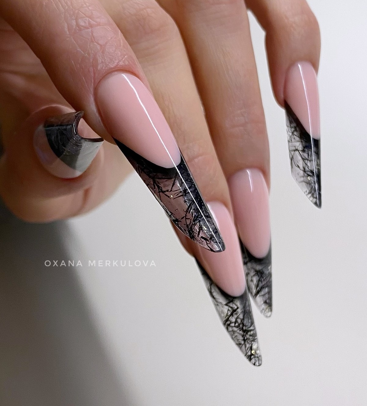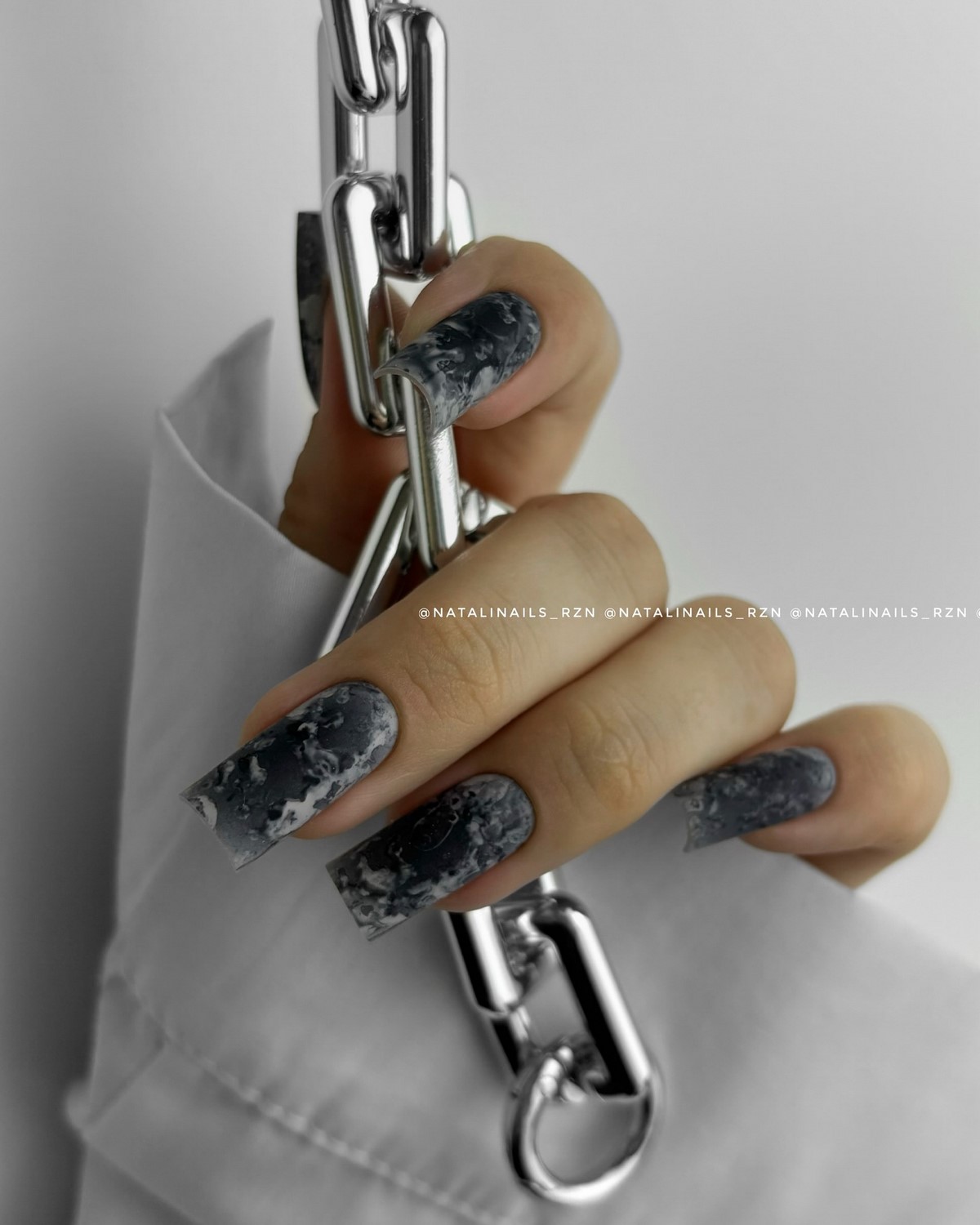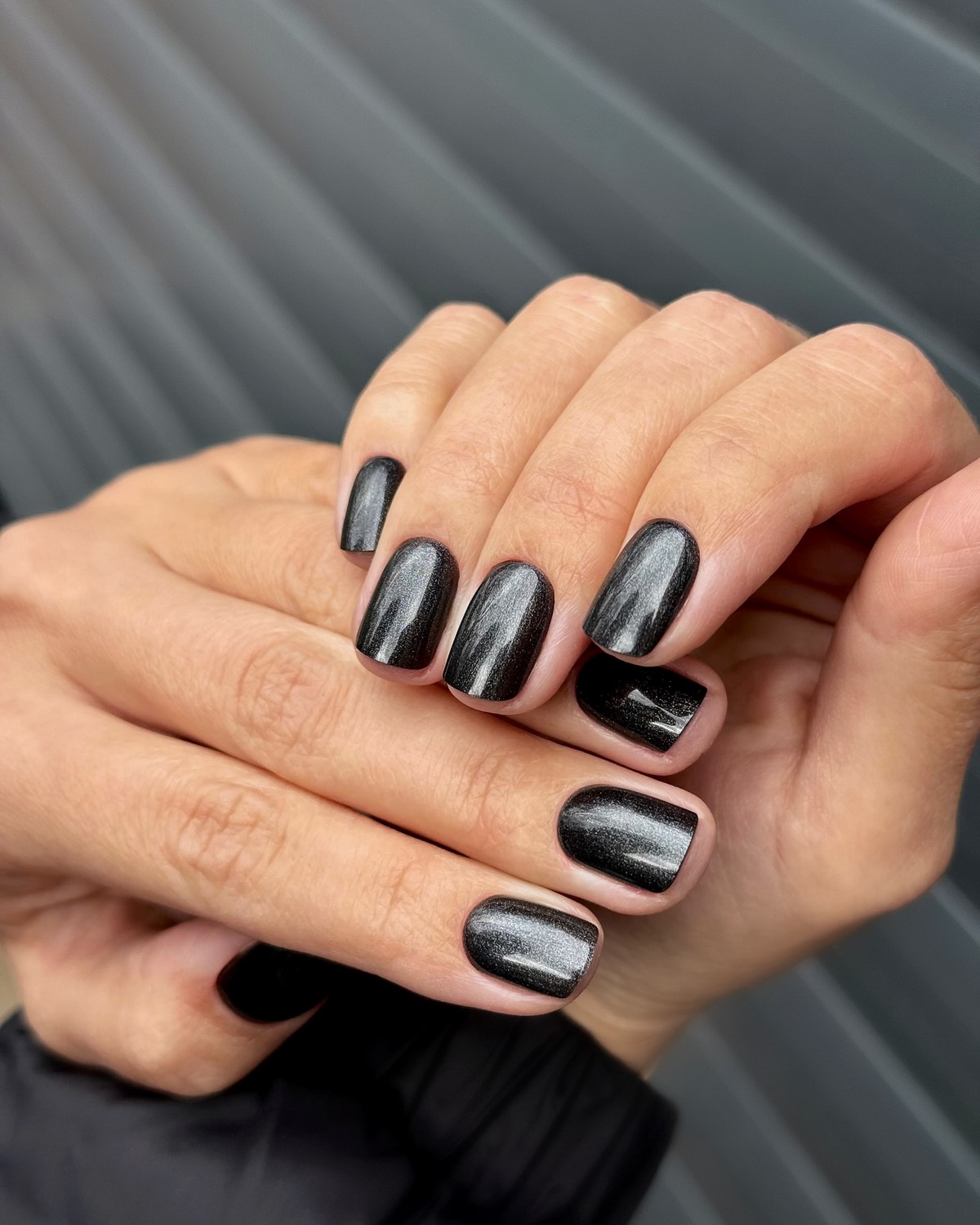 Ефект «мокрого асфальту» досягається за рахунок спеціальних металевих частинок, які створюють глибокий, майже чорний колір з характерним вологим блиском. Покриття змінює свій відтінок залежно від кута падіння світла – від глибокого графітового до сріблясто-синього. Ця техніка особливо ефектно виглядає на довгих нігтях і ідеально підходить для створення драматичних вечірніх образів.