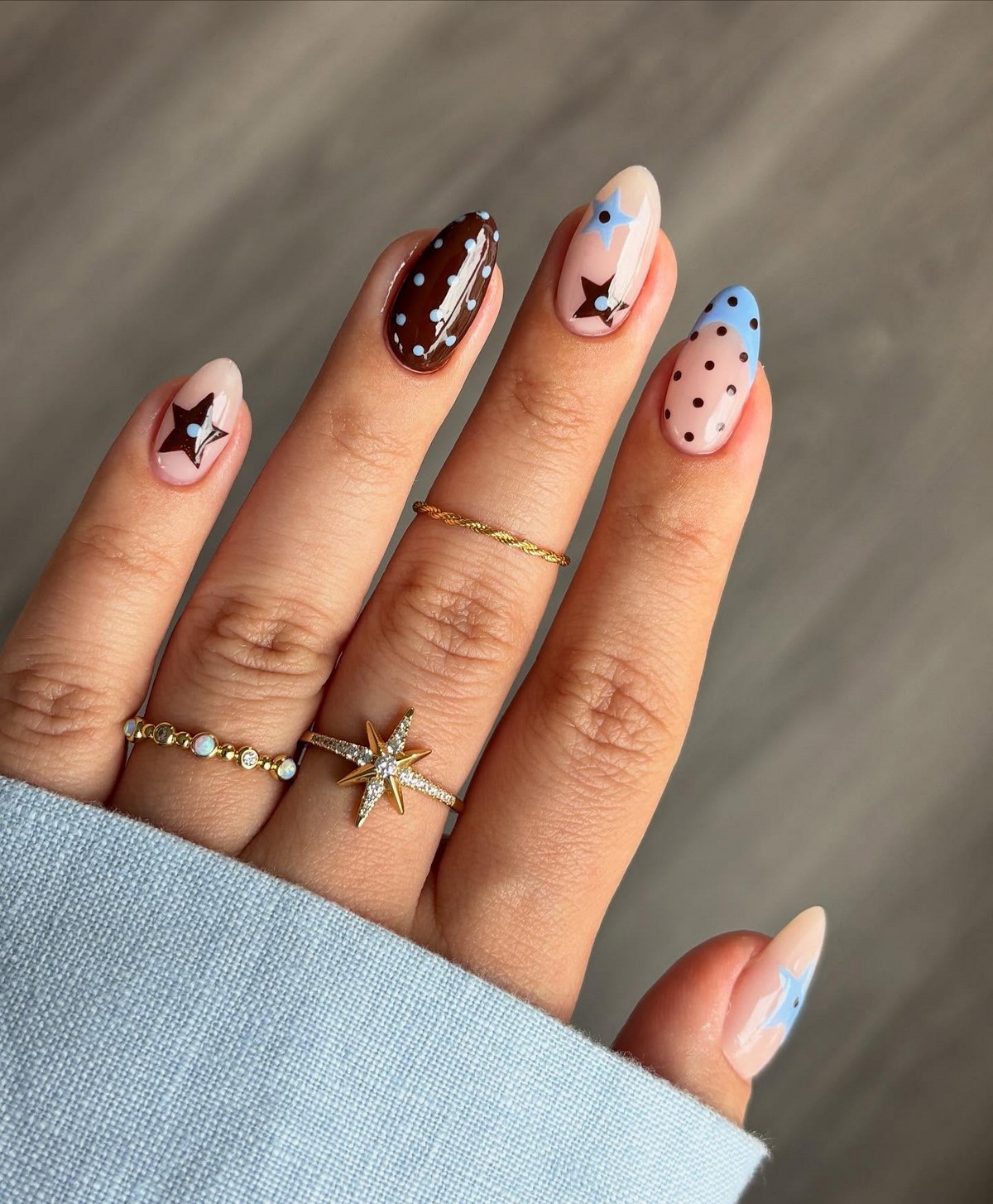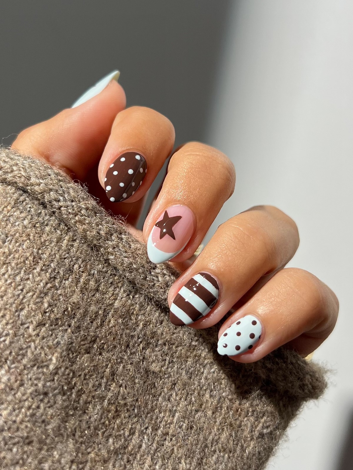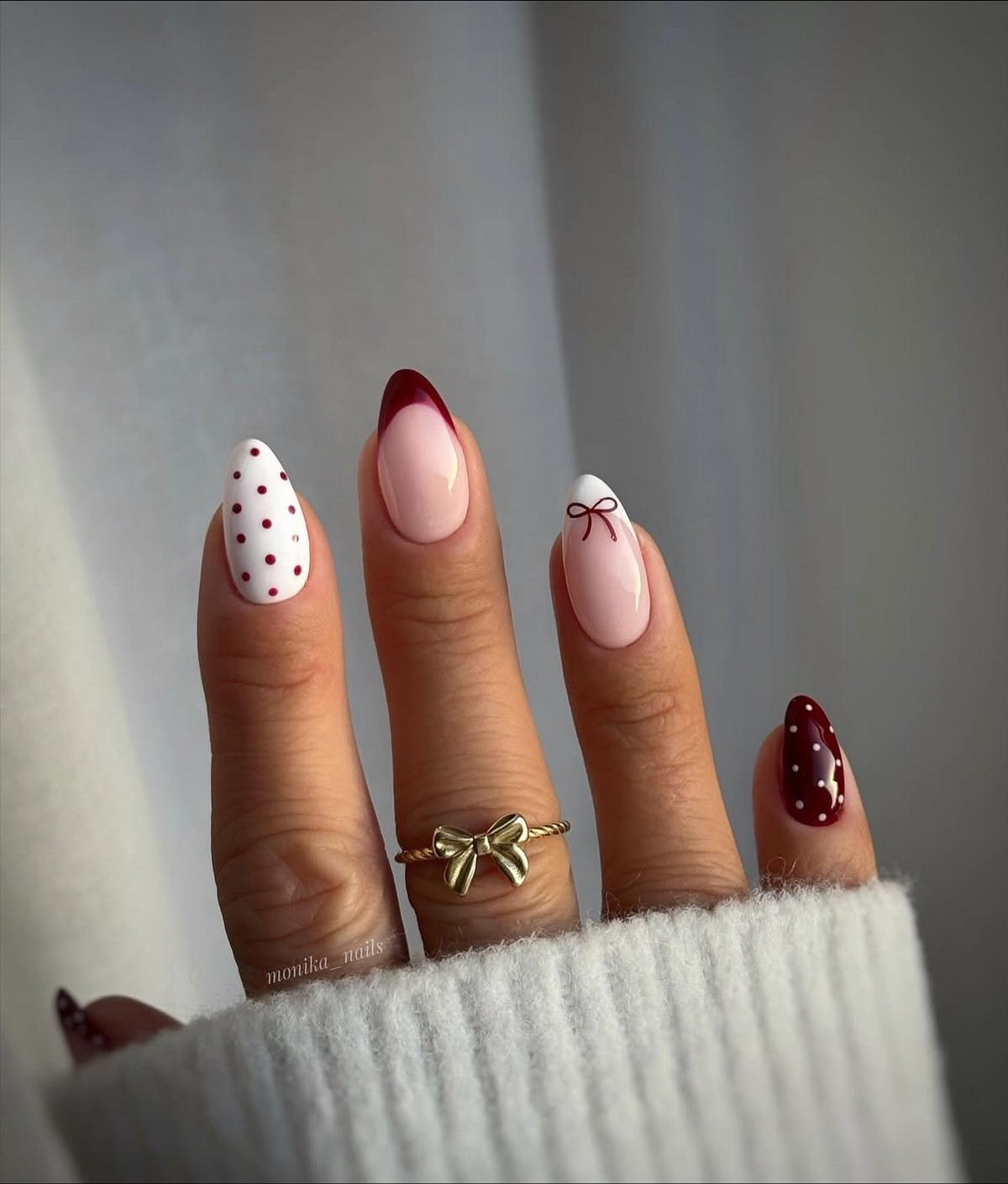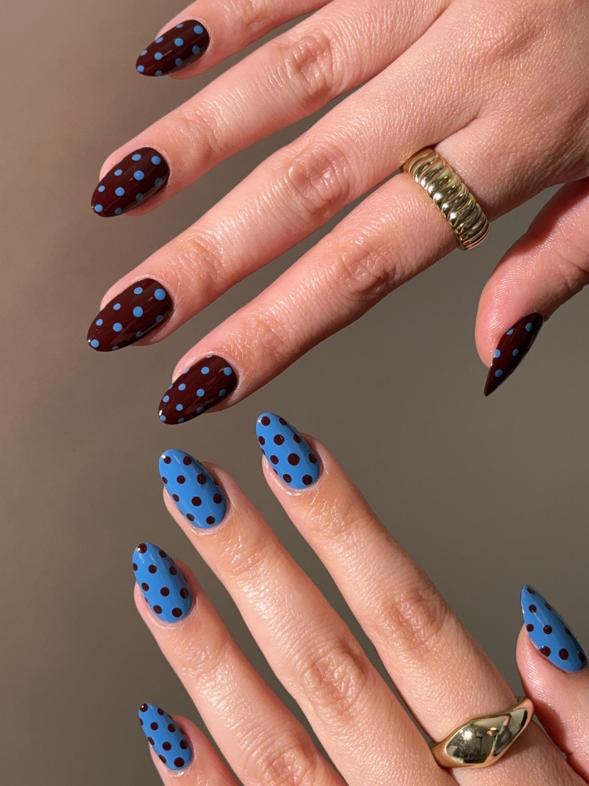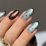 Mix&Match — це мікс різних текстур, кольорів і розмірів крапок. Наприклад, на одному нігті — великі контрастні кола, на іншому — крихітні крапки, що імітують сніжинки. Така гра робить манікюр незвичайним і динамічним. У зимовому виконанні варто вибирати спокійну палітру: білий, сірий, винний, шоколадний, сині тони.