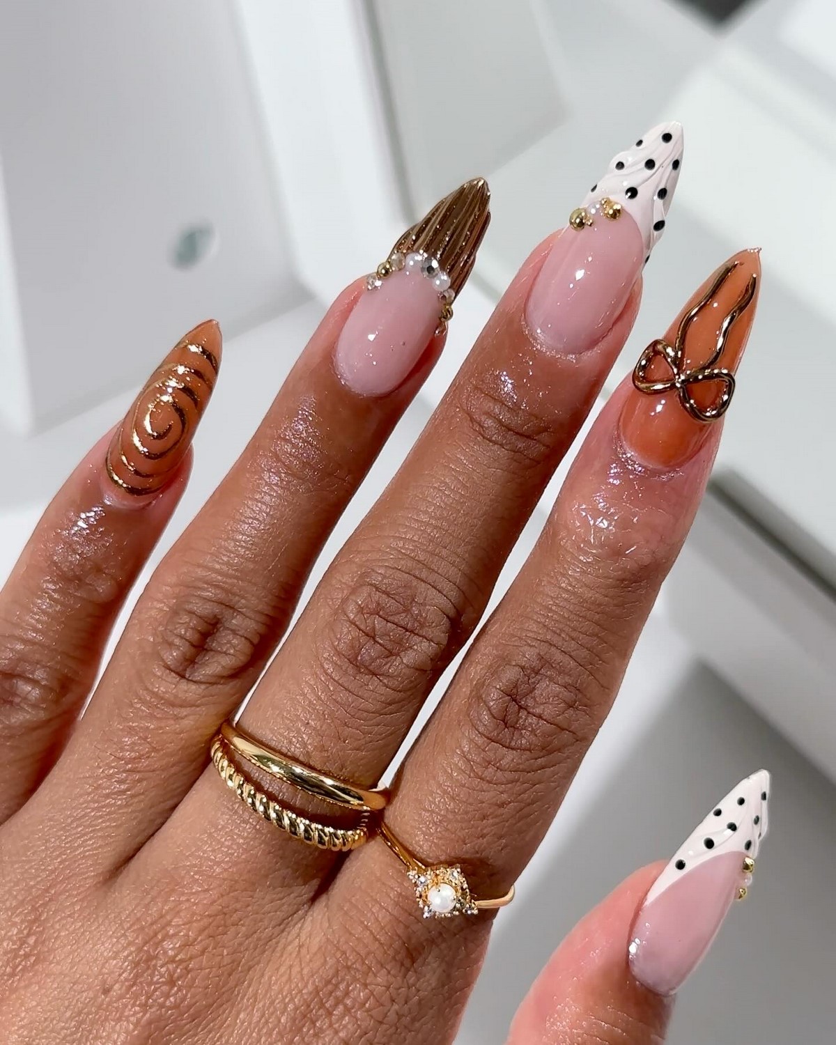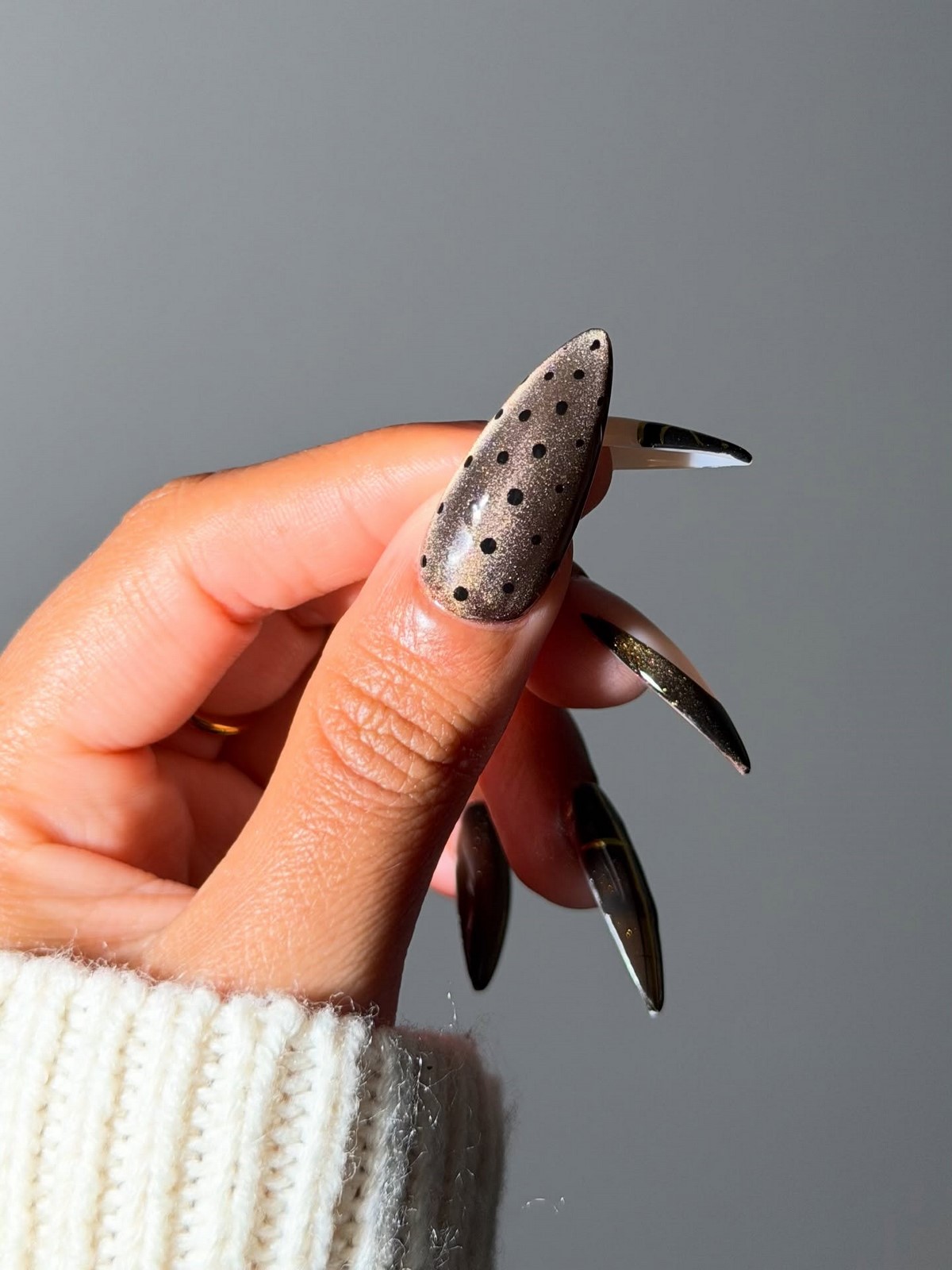 Металевий блиск став одним з головних трендів 2025 року, і Polka Dots з металевими акцентами виглядає футуристично. На матовій основі — срібні, золоті або хромовані крапки, що створюють ефект 3D. Цей дизайн гармонує з прикрасами і зимовими аксесуарами, додаючи блиску в повсякденний образ.