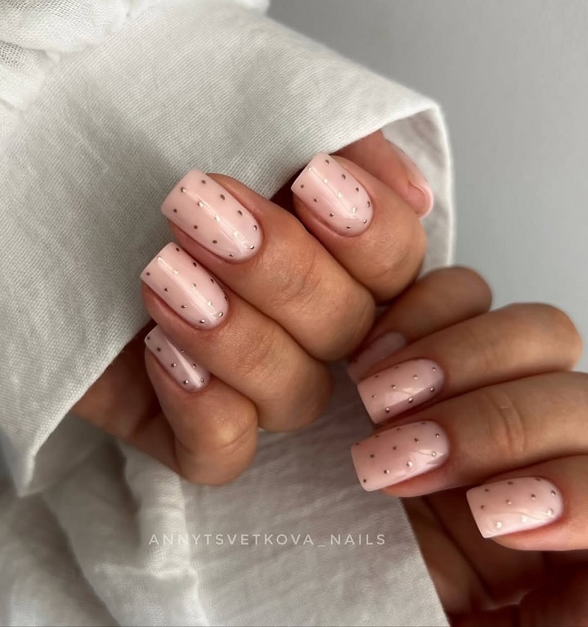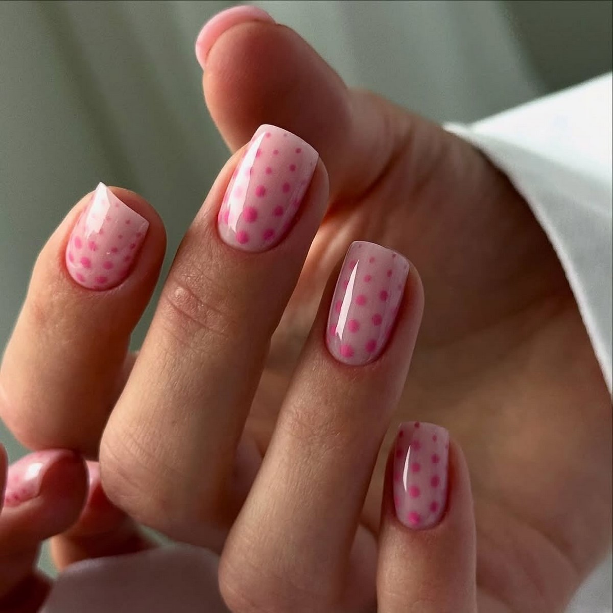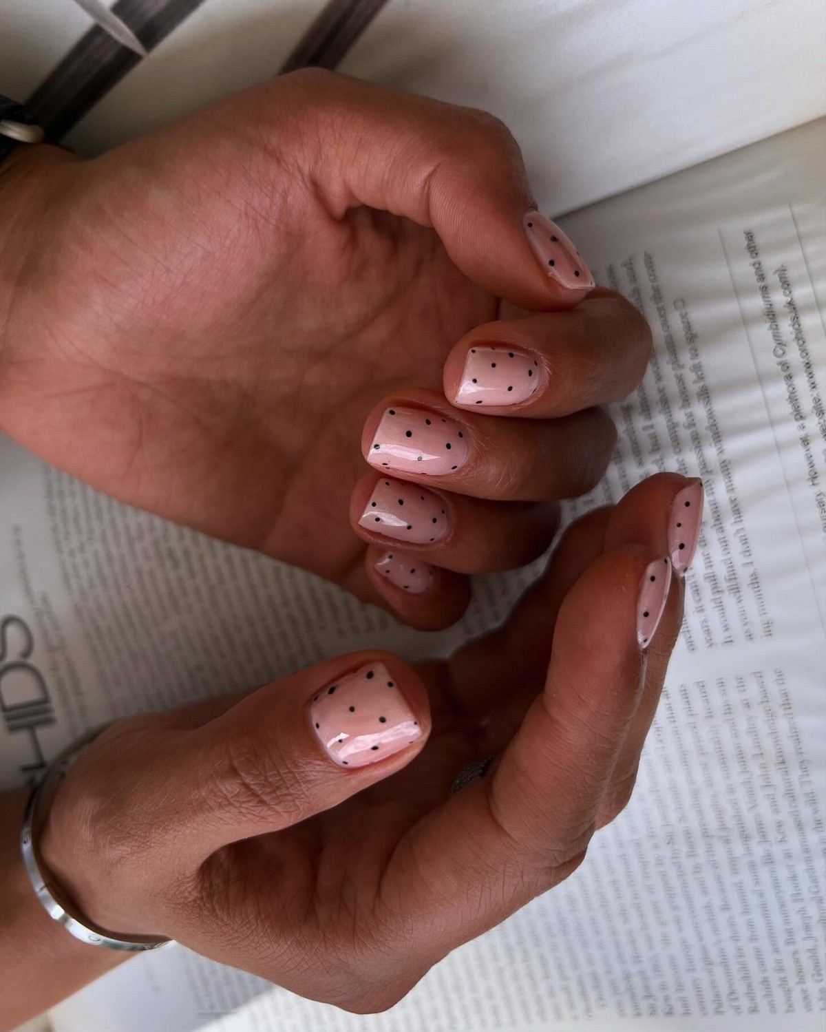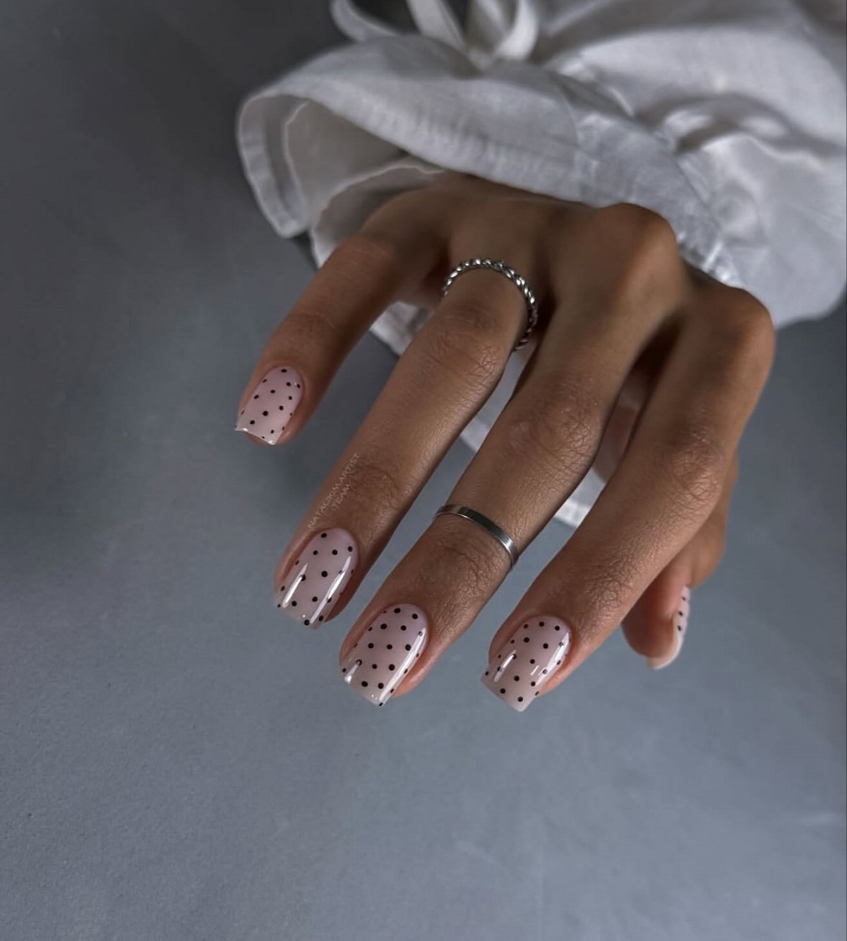 Взимку 2025 короткі нігті в моді, і Polka Dots відмінно підкреслює їх акуратність. Маленькі крапки візуально подовжують пластину, особливо якщо нанести їх вертикально. Елегантно виглядає нюдова база з білими або сріблястими акцентами. Такий дизайн практичний і ідеально підходить для повсякденного стилю.