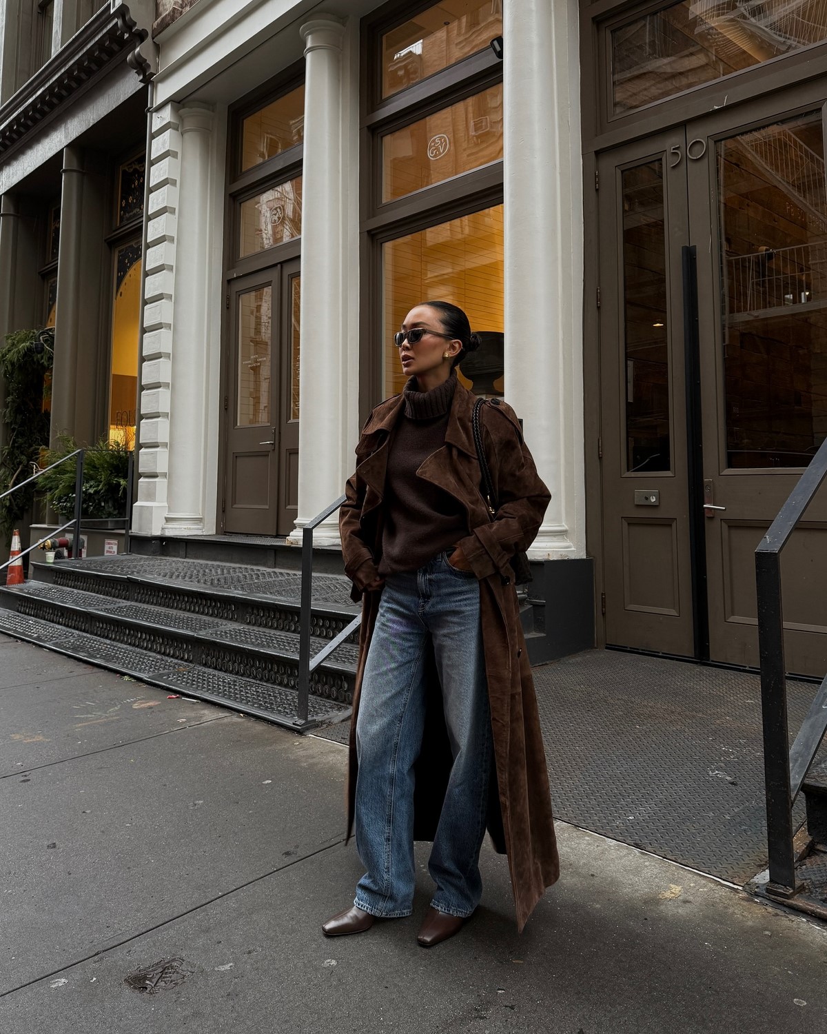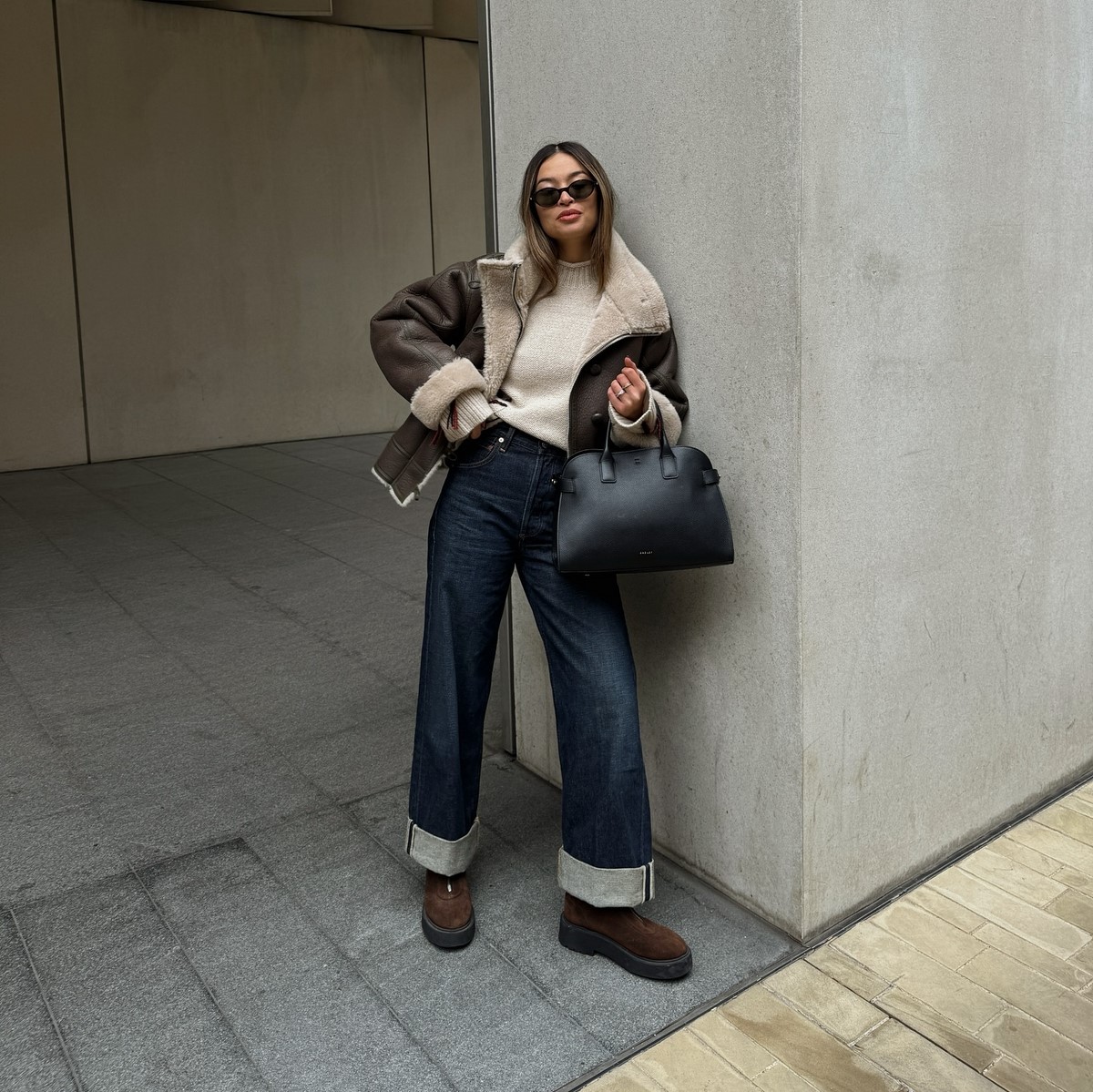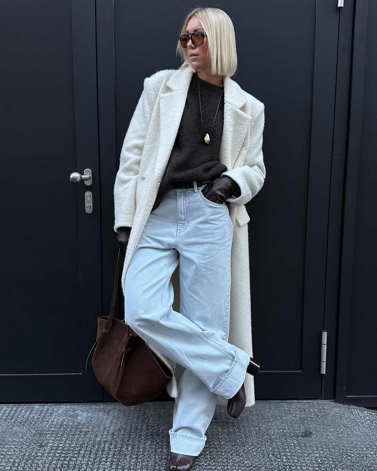 Джинси з помітними підворотами — нова класика. Вони відмінно підкреслюють взуття і додають образу розслабленої естетики. Варіанти відтінків — від індиго до «брудно-сірого». Носити їх можна з чобітьми або черевиками, а зверху — пальто або пуховик в стилі oversize.