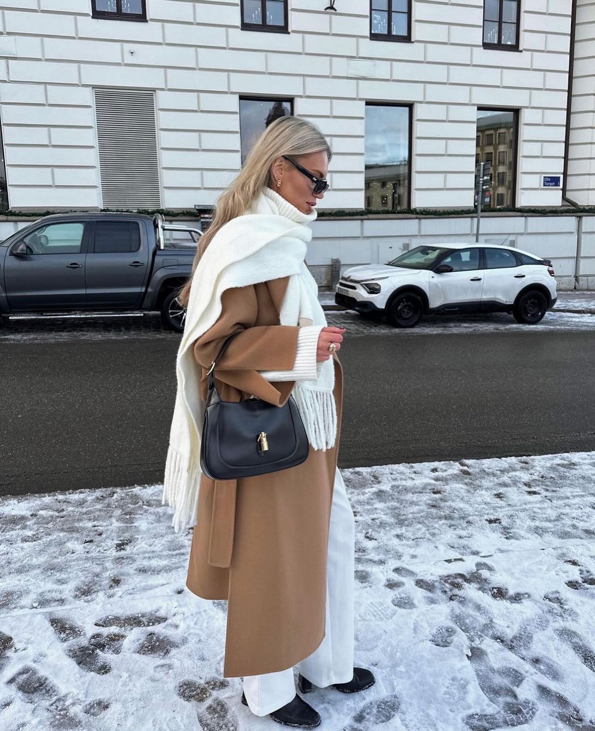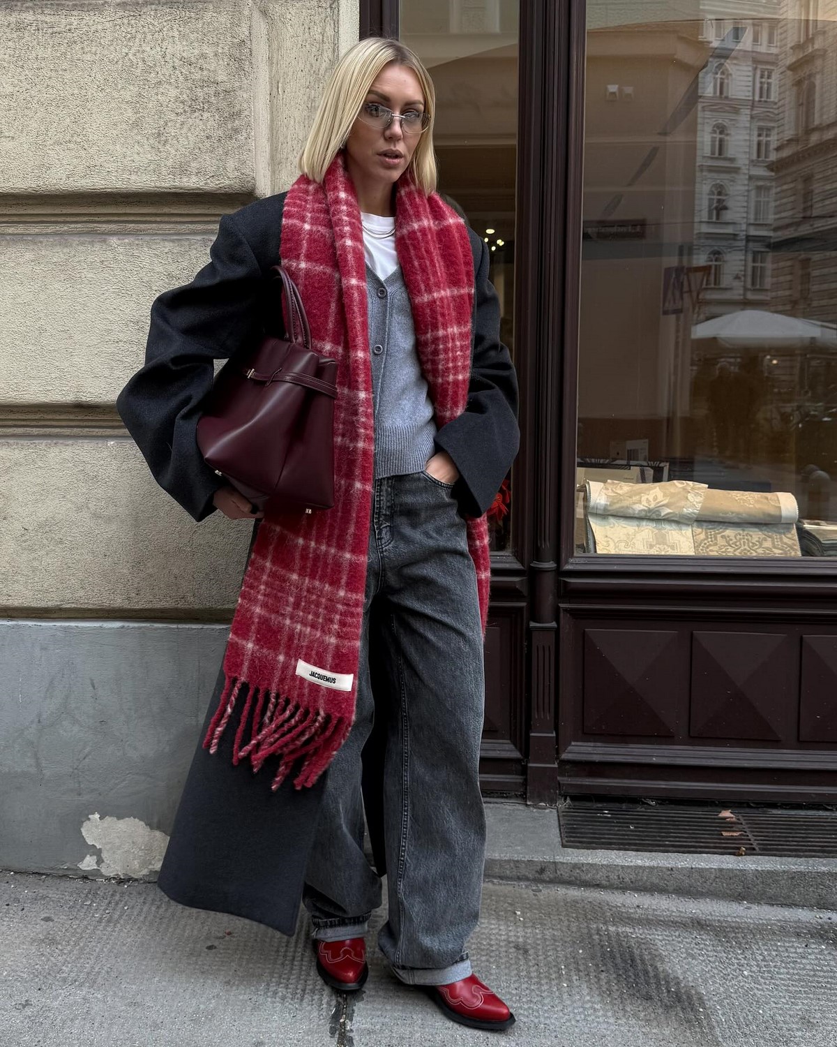 Довгий шарф — не просто аксесуар, а частина образу. Його можна кілька разів обернути навколо шиї або недбало накинути на плече. Особливо актуальні в’язані моделі великої в’язки і кашемірові варіанти в пастельних відтінках.